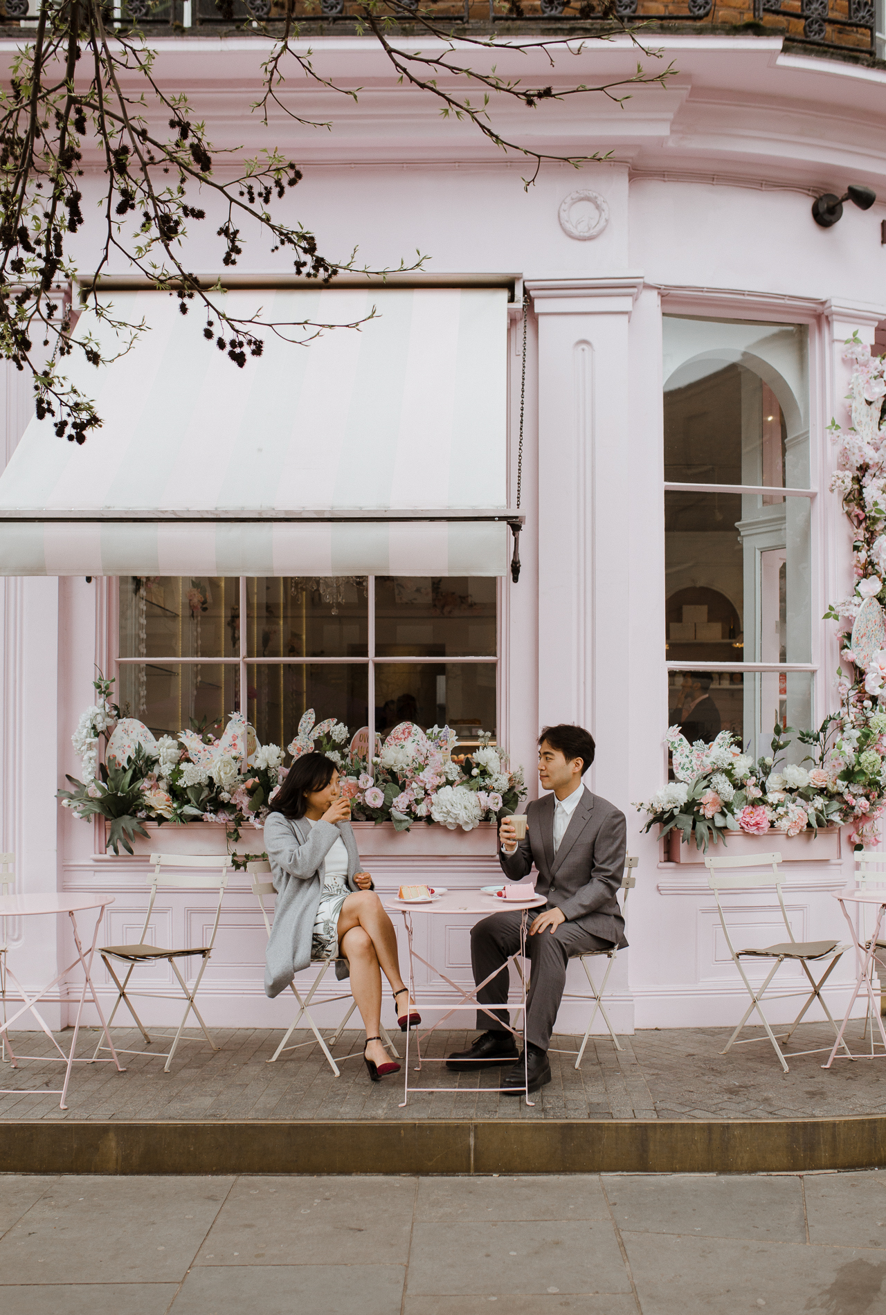 Californians’ Caleb & Haemin fly to London for their pre wedding photoshoot in one of London’s most instagrammable pink cafes. Oh and it serves champagne and cake!
